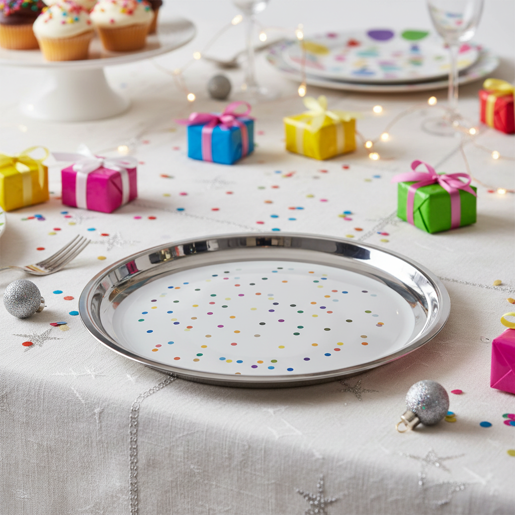 Herkomst RVS feestelijk gebaksbord bord - 20 cm - gekleurde 'confetti' stippen op spiegelend metaal