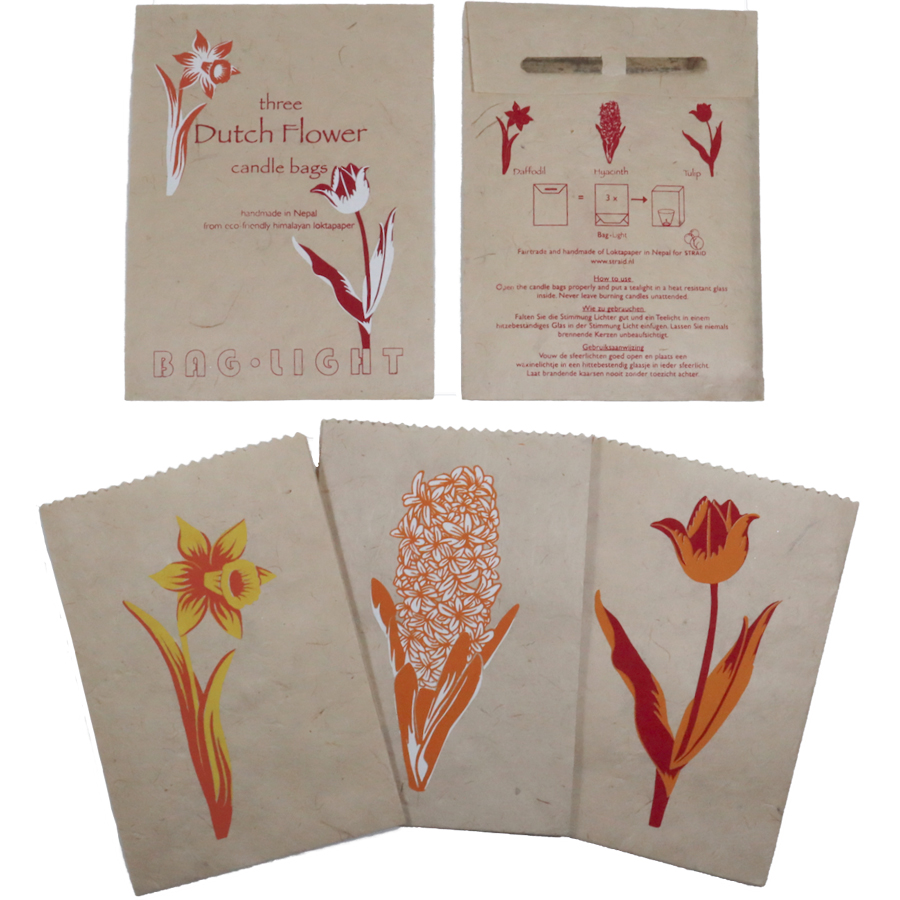 Sfeerlichten en -makers! Met een waxinelichtje in een glaasje in het sfeerlicht ontstaat een prachtig schijnsel. In een geschenkenvelop zitten drie lokapapieren candlebags met bloemenopdruk: een tulp, een hyacint en een narcis.