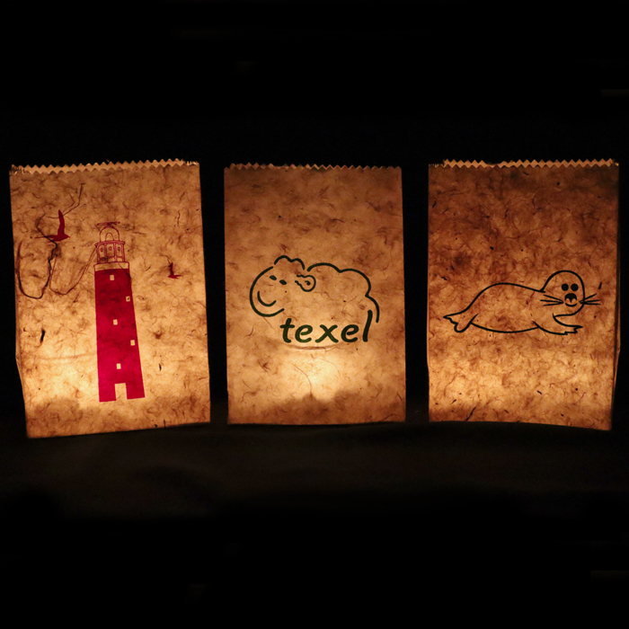 Een eerbetoon aan ons favoriete waddeneiland Texel. Op deze set van 3 handgemaakte windlichten heeft staan 3 kenmerkende Texelse afbeeldingen: een Texels schaap, de vuurtoren en een zeehond.